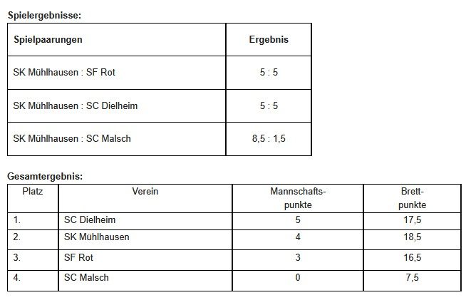 Nach zwei Runden lagen die Teams aus Dielheim und Rot mit jeweils einem Sieg und einem Remis gleichauf an der Spitze. Im entscheidenden Duell um den Turniersieg setzte sich schließlich Dielheim mit einem knappen 5,5:4,5-Erfolg gegen Rot durch – herzlichen Glückwunsch an die Sieger!